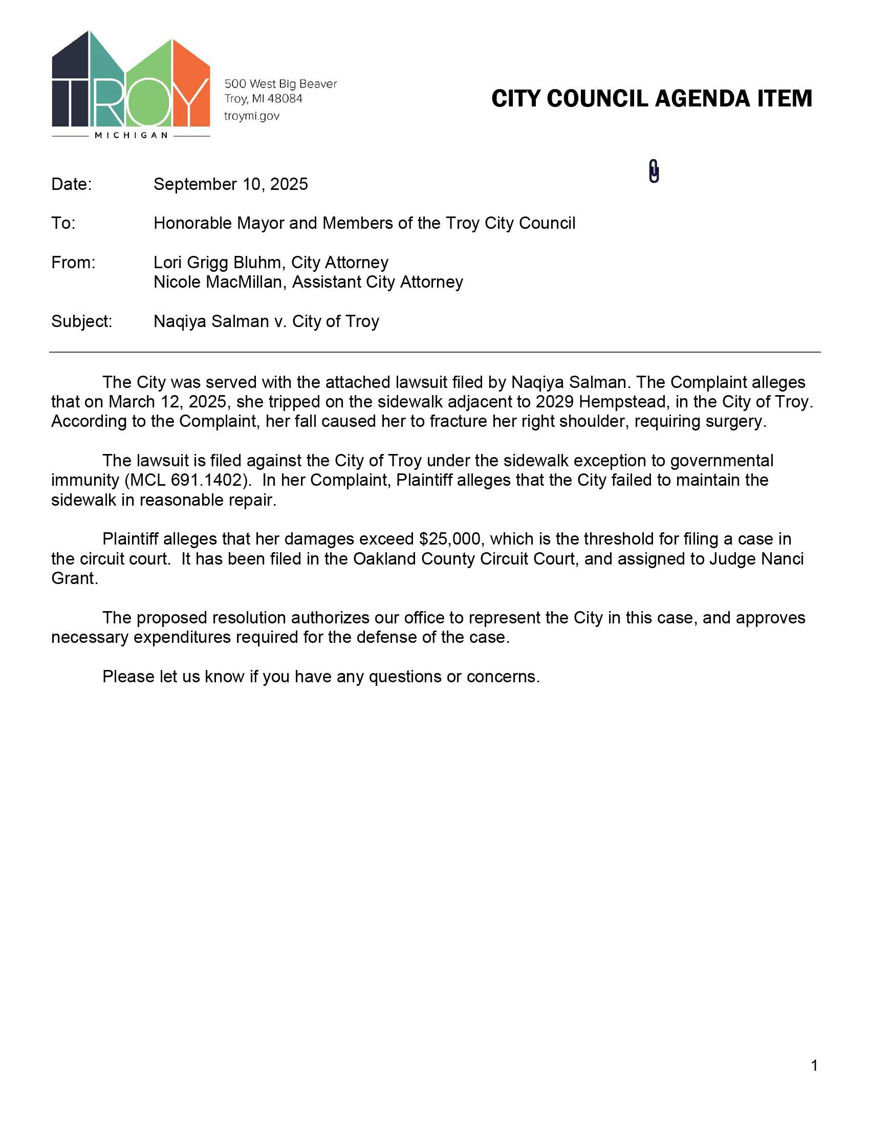 2025-09-29 City Council Regular Agenda Item J-11 Naqiya Salman V. City Of Troy