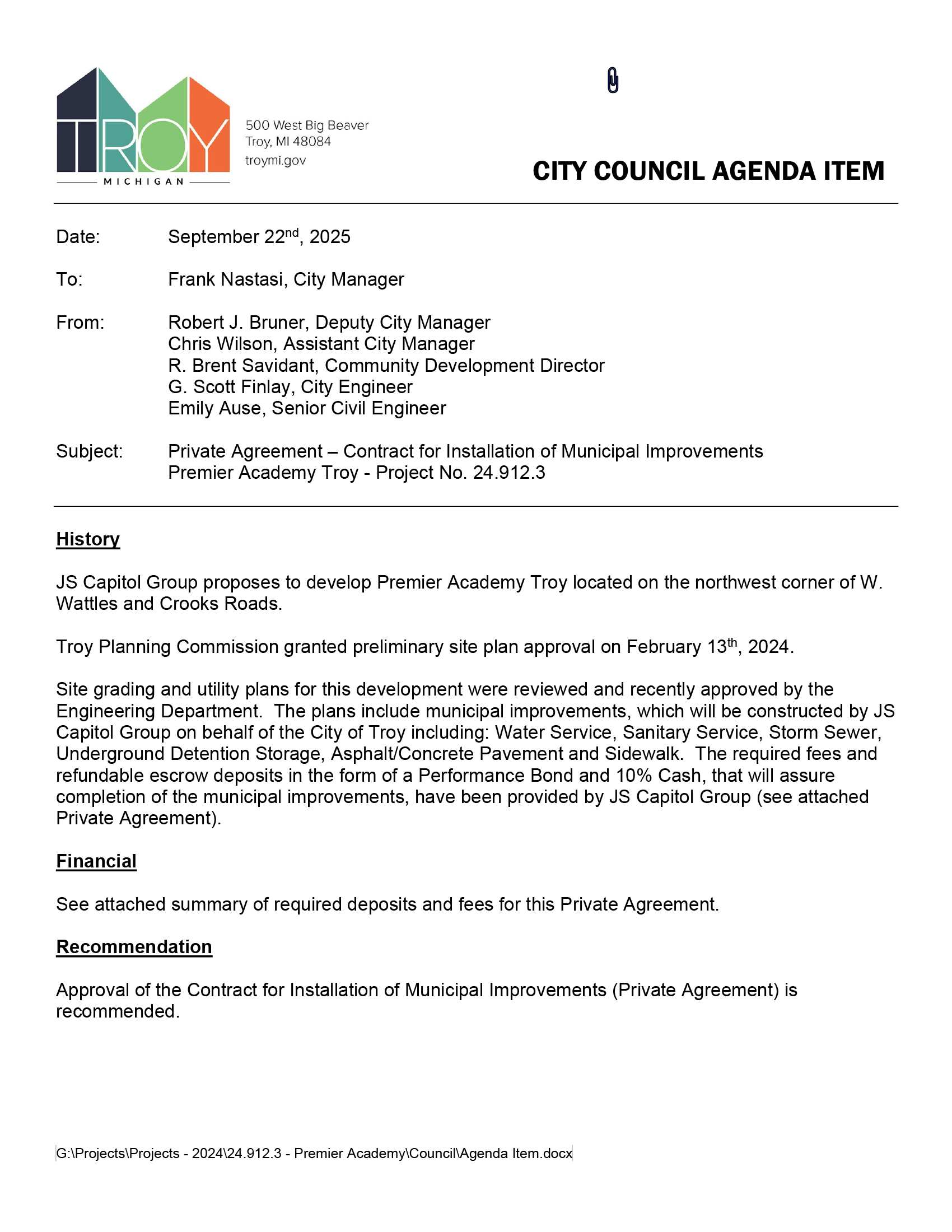 2025-09-29 City Council Regular Agenda Item J-08 Private Agreement - Contract For Installation Of Municipal Improvements - Premier Academy Troy - Project No. 24.912.3
