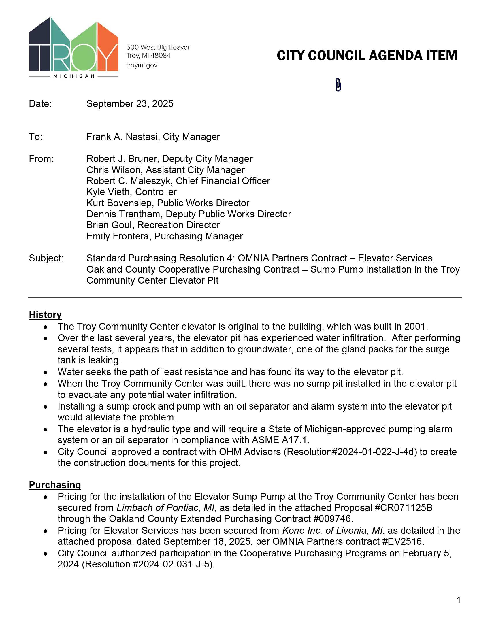 2025-09-29 City Council Regular Agenda Item J-04D Spr4 Omnia Partners Contract - Elevator Services; And Oakland County Cooperative Purchase Contract - Sump Pump Installation In The Troy Community Center Elevator Pit