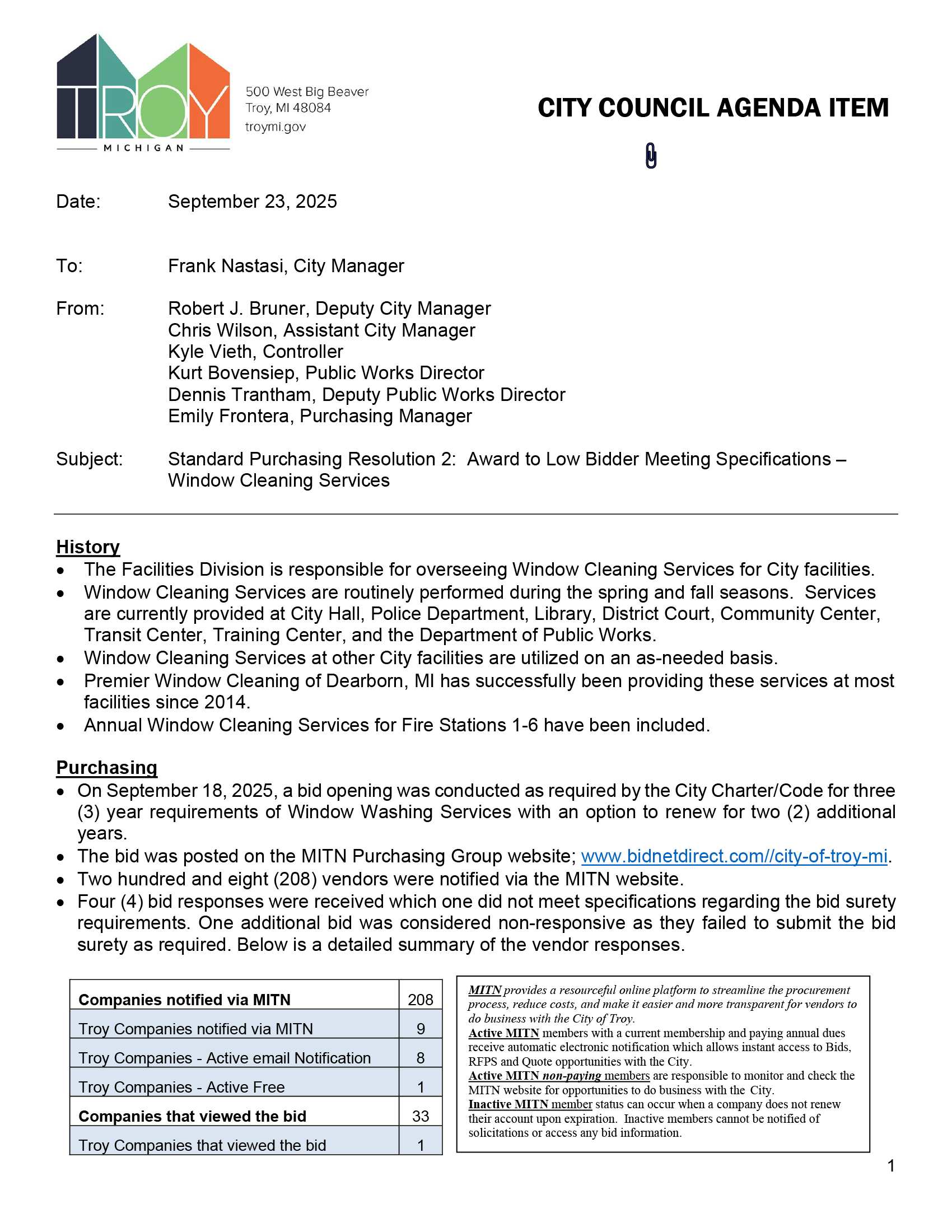 2025-09-29 City Council Regular Agenda Item J-04A Spr2 Award To Low Bidder Meeting Specifications - Window Cleaning Services