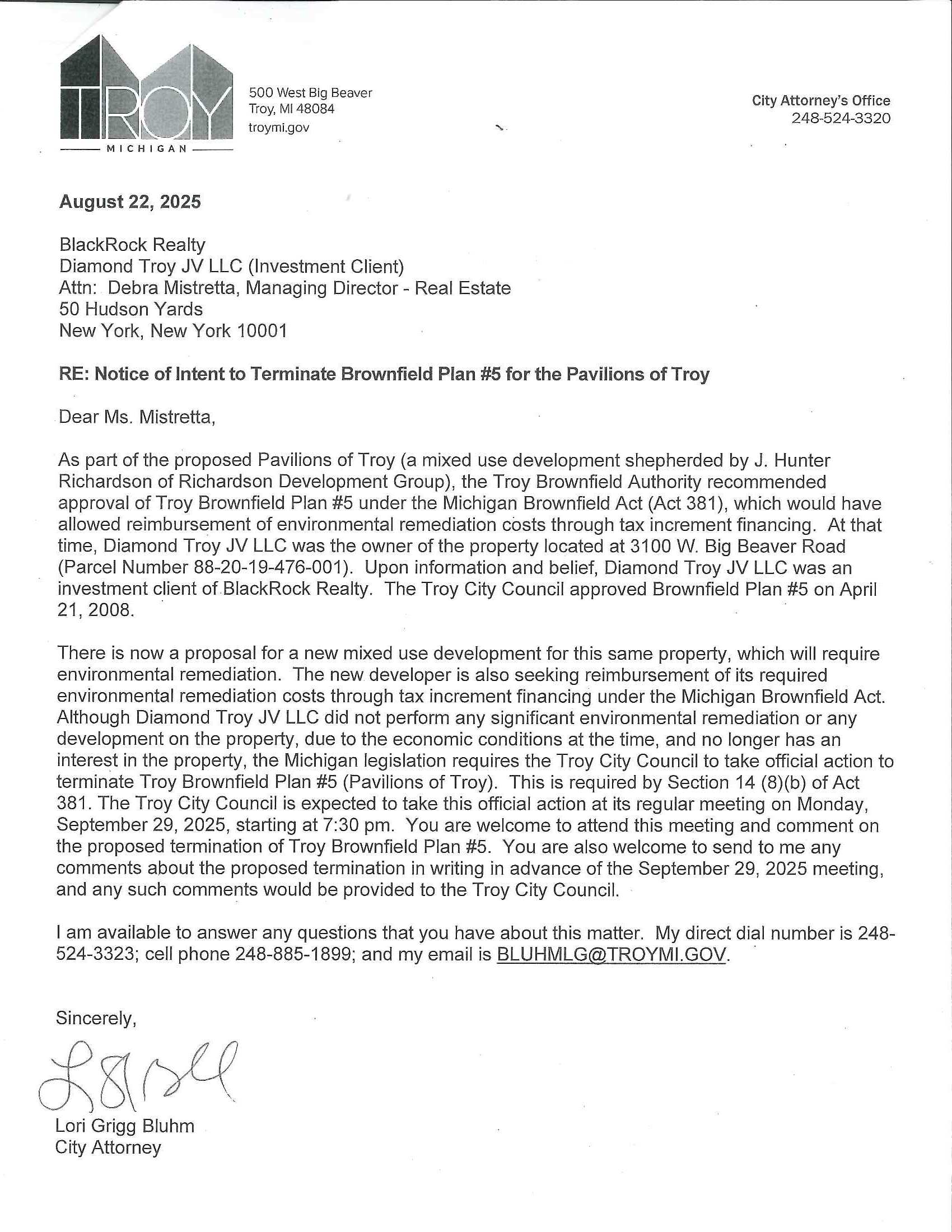 2025-09-29 City Council Regular Agenda Item E-01 Termination Of Brownfield Redevelopment Plan #5 (Pavilions Of Troy) And Approval Of Brownfield Redevelopment Plan #12