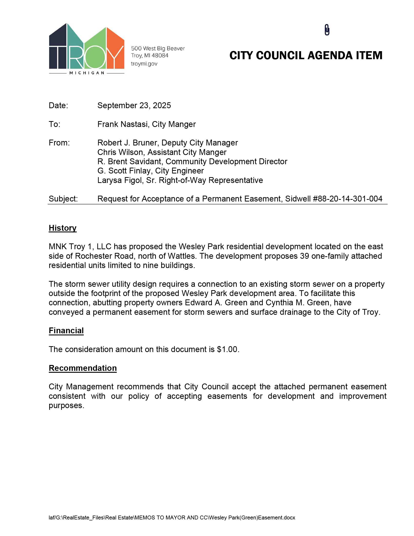 2025-09-29 City Council Regular Agenda Item J-09 Request For Acceptance Of A Permanent Easement, Sidwell #88-20-14-301-004