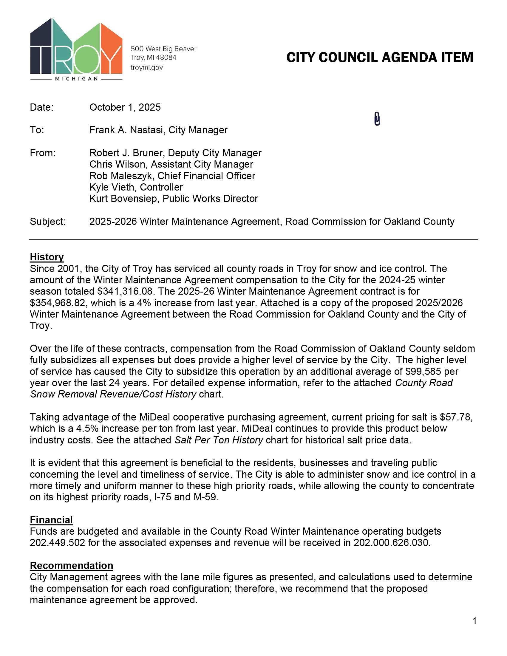2025-10-06 City Council Regular Agenda Item J-05 2025-2026 Winter Maintenance Agreement, Road Commission For Oakland County