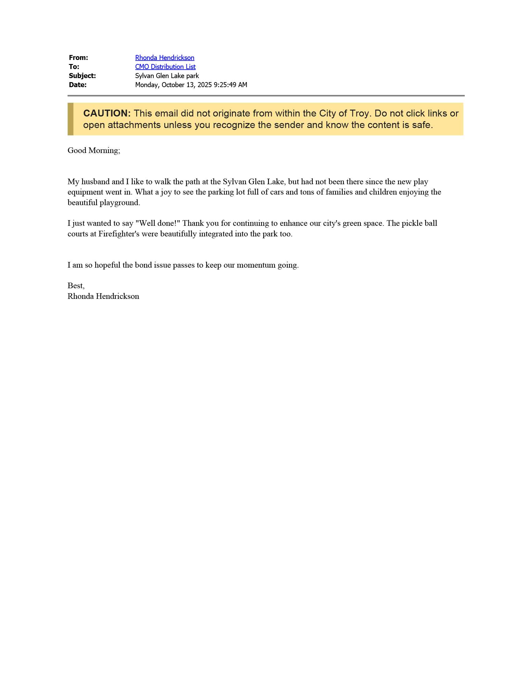 2025-10-20 City Council Regular Agenda Item O-03A Loa To The City Of Troy From Rhonda Hendrickson Regarding Sylan Glen Lake Park