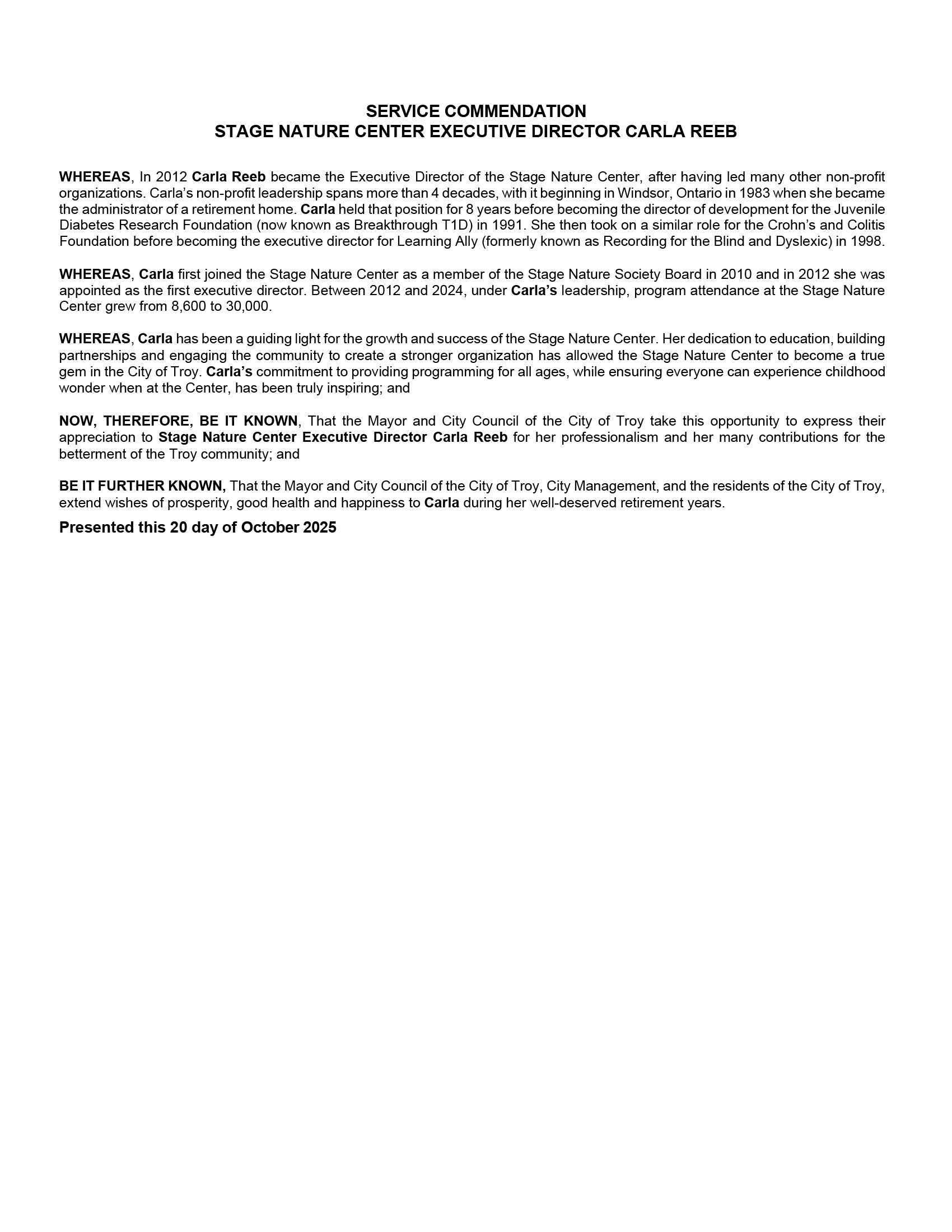 2025-10-20 City Council Regular Agenda Item C-02 Service Commendation - Stage Nature Center Executive Director Carla Reeb
