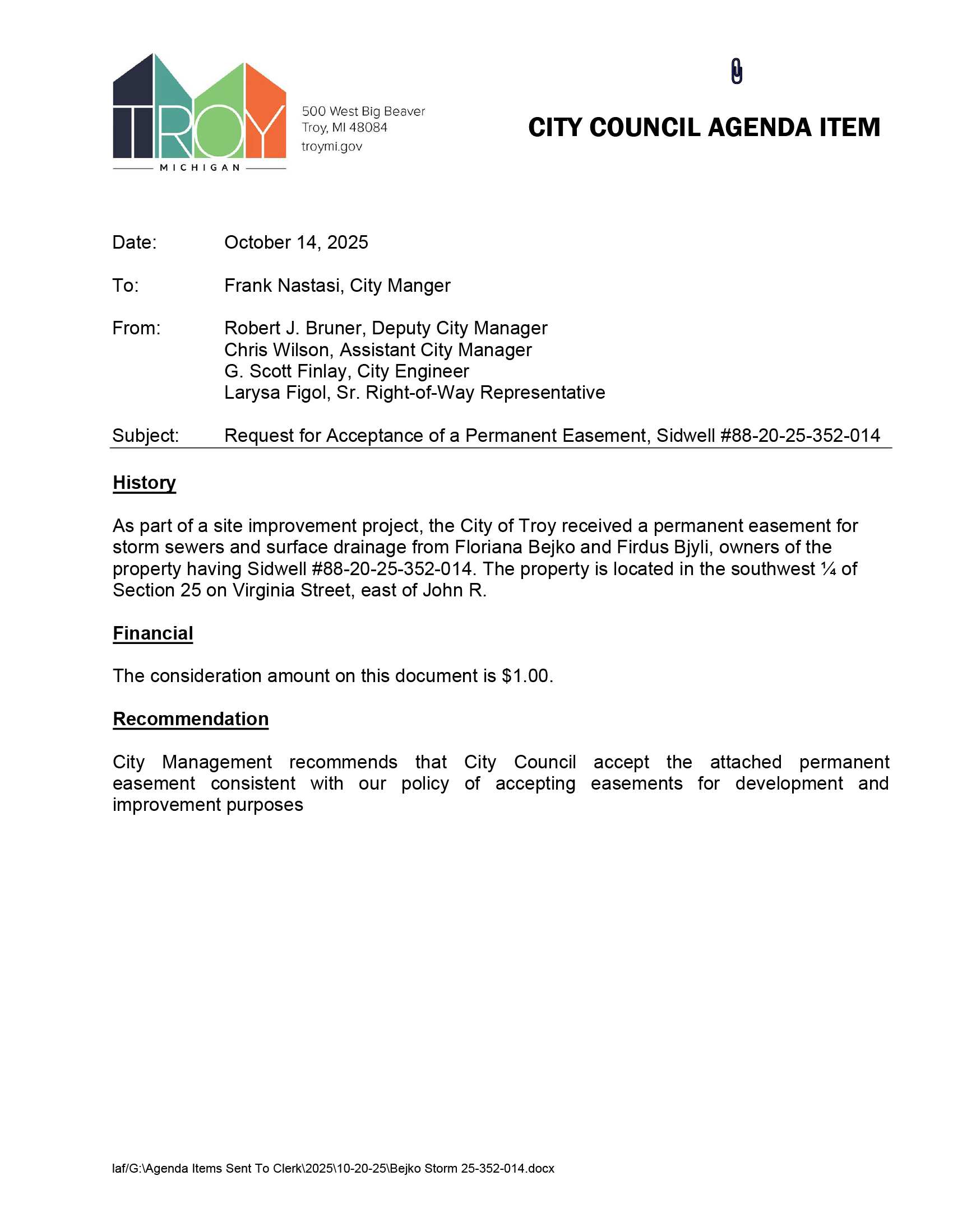 2025-10-20 City Council Regular Agenda Item J-05 Request For Acceptance Of A Permanent Easement, Sidwell #88-20-25-352-014