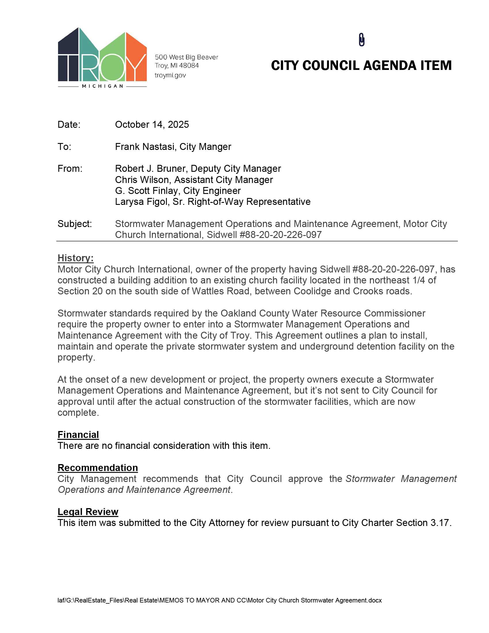 2025-10-20 City Council Regular Agenda Item J-09 Stormwater Management Operations And Maintenance Agreement, Motor City Church International, Sidwell #88-20-20-226-097