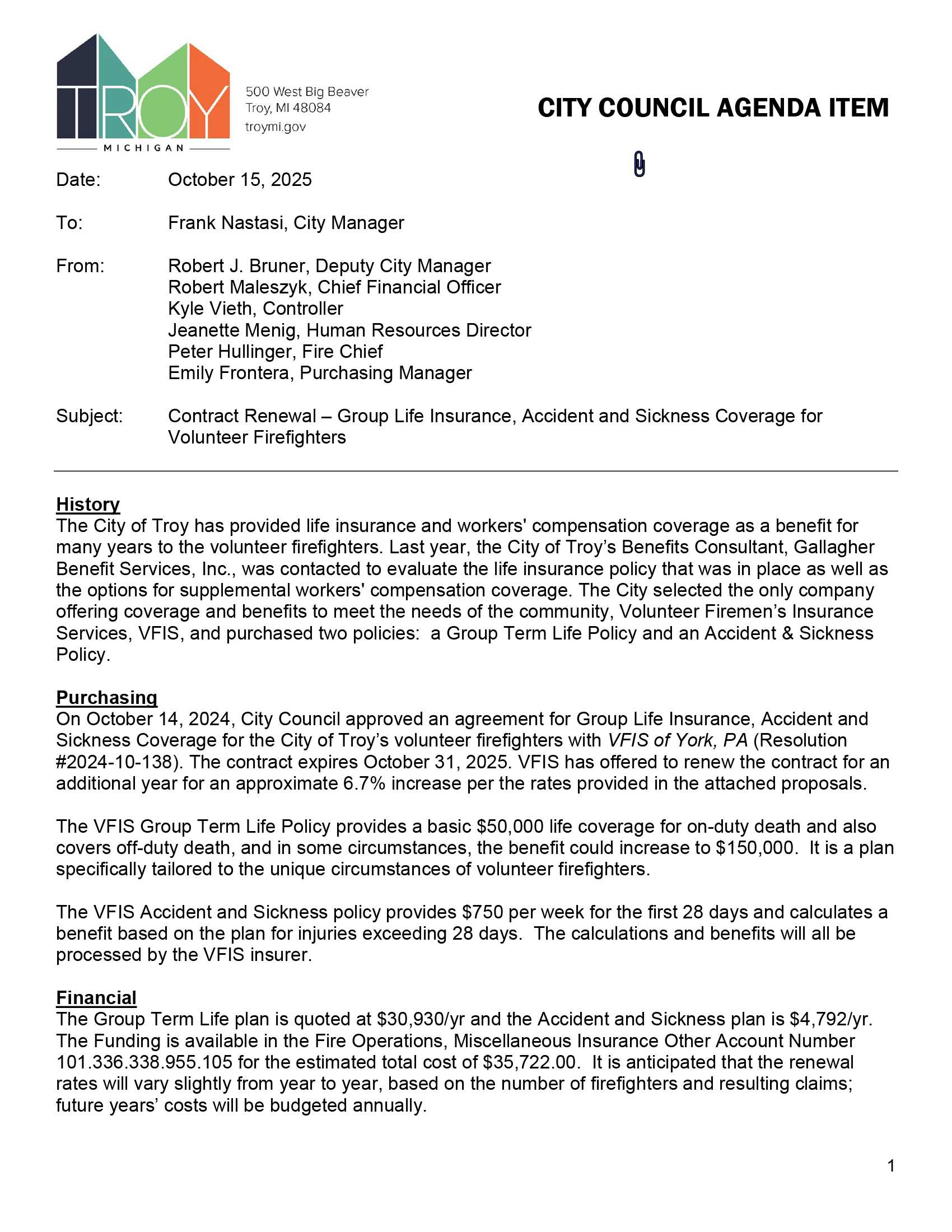 2025-10-20 City Council Regular Agenda Item I-04 Contract Renewal - Group Life Insurance, Accident And Sickness Coverage For Volunteer Firefighters